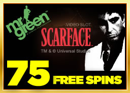 This website is completely dedicated to the Scarface game and, if you’ve been following our news, will know that the much anticipated slot was first available to play last Monday . Mr Green Casino was one of the first online casinos to offer the game. The game has proved a huge hit this week with Net Entertainment (the slot creator) stating they’d never seen activity like it before. Mr Green Casino are celebrating the launch of the hit Scarface game with up to 75 free spins this weekend – here are the requirements to get them: